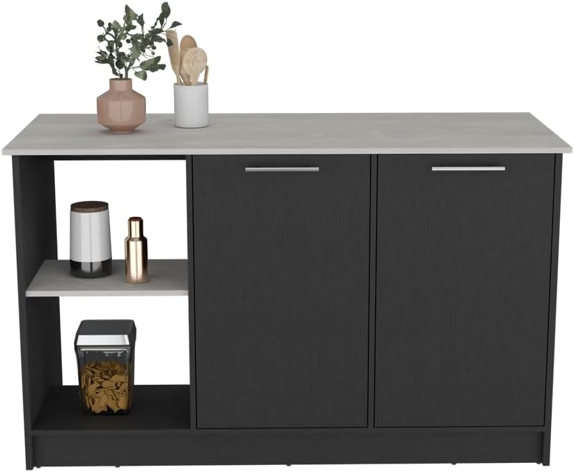 This kitchen island provides a large countertop ideal for food prep and extra dining space. It features open shelves for easy access to daily items and a double-door cabinet with inner shelves for concealed storage. With an elegant design and durable construction, it fits well with various kitchen styles.