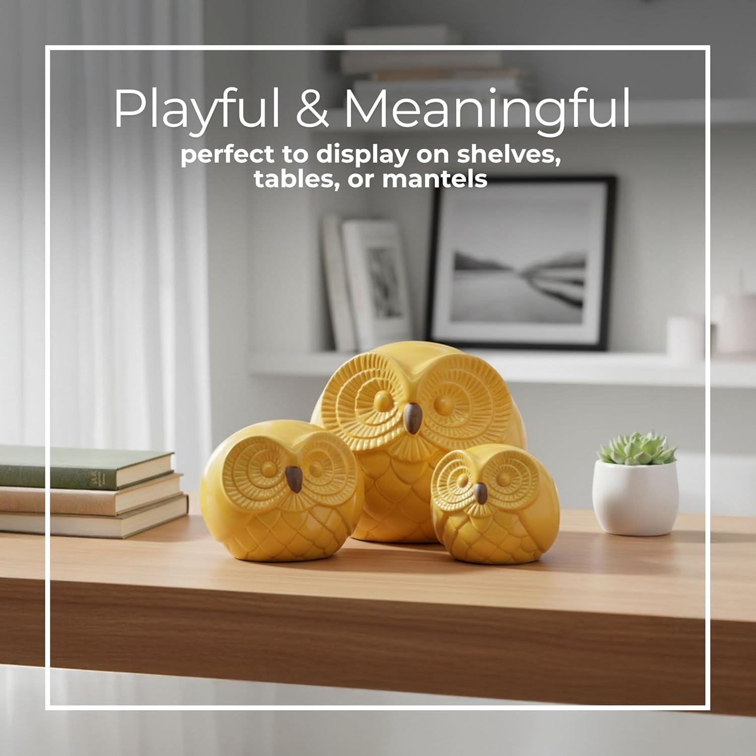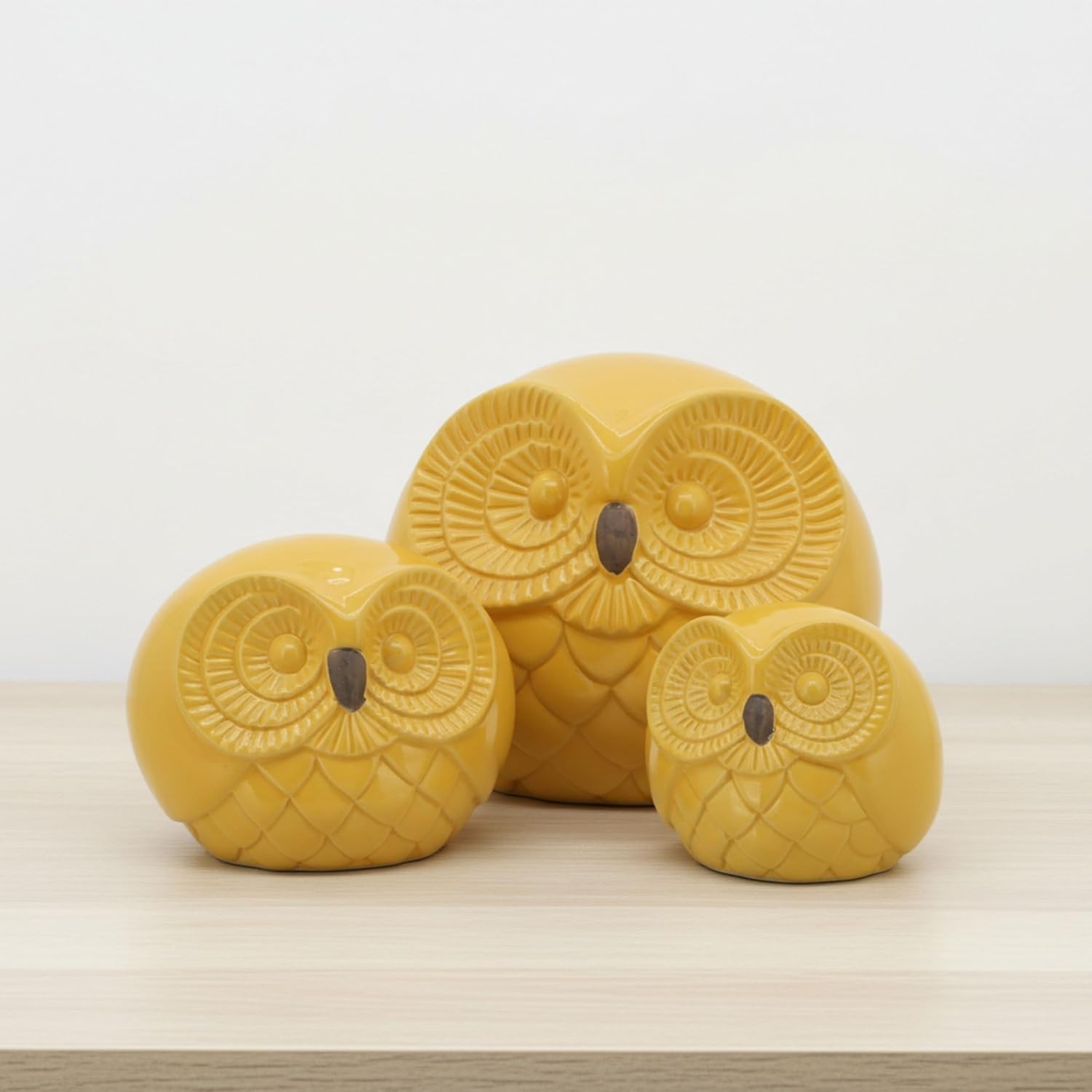 Bright and sculptural, this ceramic owl set brings playful form, coordinated color, and visual balance to interior spaces through three rounded silhouettes designed for layered styling. Finished in a yellow tone, each owl offers a distinct scale that allows you to build depth and proportion across shelves, consoles, and tabletop arrangements without overwhelming the surrounding decor. Designed to style effortlessly alongside decorative books, bird decor themes, and curated home decor accents, this set adds personality and warmth while remaining decorative rather than novelty driven. Measuring 8" L x 8" W x 6" H, 6" L x 5" W x 4" H, and 4" L x 4" W x 4" H, the trio provides flexibility for both grouped and separated placement, making it easy to style narrow surfaces, mantels, coffee tables, or open shelving where varied height creates visual interest. The smooth ceramic finish pairs beautifully with neutral palettes, natural textures, and mixed materials, and it complements gold decor details when layered into transitional or eclectic interiors that benefit from a pop of color and subtle shine. Arrange the owls together to create a cohesive focal display, or spread them throughout a room to establish visual continuity and repetition across different surfaces. On dining surfaces, layer them with table decorations to anchor a centerpiece arrangement, or position them alongside candles, bowls, or serving pieces for everyday styling that feels intentional rather than staged. Their rounded shapes soften linear furniture lines and add approachability to modern, farmhouse inspired, or mixed style interiors. Designed for decorative use only, these ceramic accents are easy to wipe clean and maintain, making them a practical choice for frequently styled spaces that need to remain polished from daily routines through hosted gatherings, while offering lasting charm and flexibility as your decor evolves.