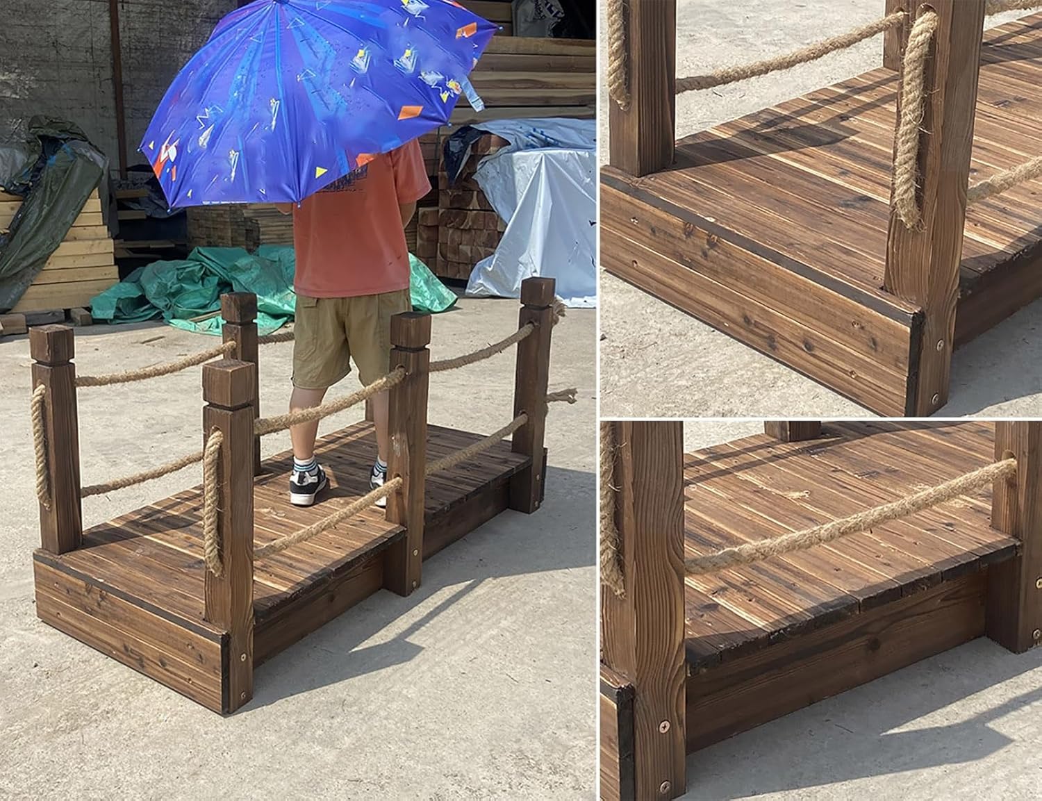 ● The decorative wooden bridge is perfect for decoration in the garden, the backyard, near the pond or any other landscaping. Natural wood finish, looks fashionable and elegant, can add charm to the corners of your garden, or you can place it to visually connect different elements in your landscape.● Specification:- Material: Solid Wood- Weight Capacity: 250 kg / 550 lbs● Features:- Natural wood strong construction, and looks fashionable.- Safety ropes on both sides prevent rolled-over for safety.- Retro solid wood frame to fit most landscaping.- The carbonized wood surface prevents cracking and splitting, suitable for outdoor.- Easy to assemble.- Make a great addition to your pond, creek, garden, backyard, courtyard, patio, farm.● Package Content:- 1 × Wooden Bridge (All Install Fitting Included)● Warm Prompt:- Please consider the weight capacity before stepping on it.- Due to light and personal differences in color understanding, there will be small color difference, in kind, prevail.- Due to different measurement methods, the error is generally 1-2 cm, and the error range is not within the quality range.● Service Guarantee:- We provide high-quality customer service. For any questions about the decorative wooden bridge, please contact us as soon as possible, and we will answer and solve your questions.