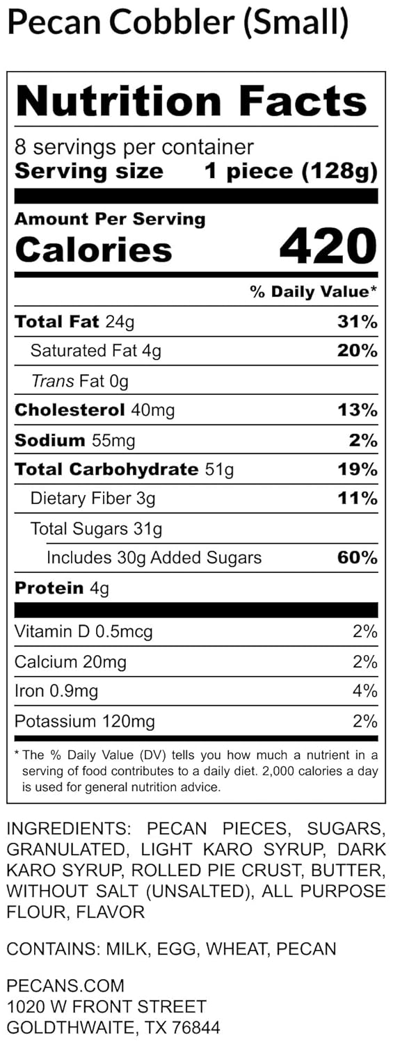Pecans.com's Cousin Rubie's Pecan Cobbler, is an old Texas Tradition, baked with the finest fresh shelled pecans available! *6.125"W x 8.75" L x 2"H *2.5 lbs. old family recipe pecan goodness.