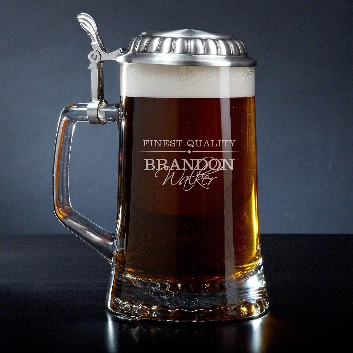 Why would anyone drink beer out of anything other than this personalized beer stein? If you love beer, then you will really enjoy drinking out of a glass that was made to enhance both the flavor and beer head. Crafted from Italian glass, this mug's pewter lid on top adds a decorative, classy look. Even when this isn't being used for beer, it makes an amazing vintage decor piece that anyone would love to display inside their home. This beer stein can be personalized with the selected design, making this an amazing gift for your husband or groomsmen as a keepsake. It measures 6.5" x 3.75" x 3.75" and can hold 16 ounces.