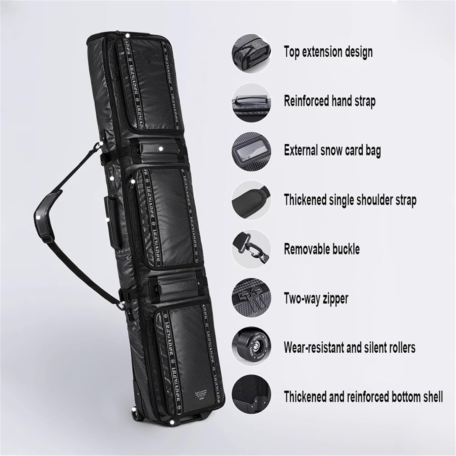 Burly Carry HandlesThe handle is made of quality rubber and has wear resistance. It is convenient for transportation and no need to worry about breaking.Easy To CarryDurable carrying handles removable shoulder strap to make your ski luggage easy to carry when you travel.Silky Smooth Durable ZipperZippers are extra strong and durable that can withstand heavy loads.It is silky smooth and not easy to stuck when the zipper is used,don't worry about it damaged.With Two Additional HandlesTwo additional handles are added, you can mention this snowboard bag with two hands to facilitate handling.Smooth WheelsFree your hand by rolling your bag while traveling. Our Silent tank wheels with Mute bearing wheels ensure smooth rolling mobility.Product Name: ski-bagsMaterial: Encrypted 900D nylonClosure Type: ZipperStrap Type: AdjustableColor: Black,WhiteProduct Dimensions: 165*34*14cm(L x W x H)Weight: about 4.5 KilogramsSuggested Users: Unisex AdultBack method: hand/oblique span/back of the backOpportunity: Great for snowboarding, skiing, sledding, snowmobiling, cross country skiing, downhill skiing, and other outdoor winter sports activities.include:1 × Bring wheel ski bag
