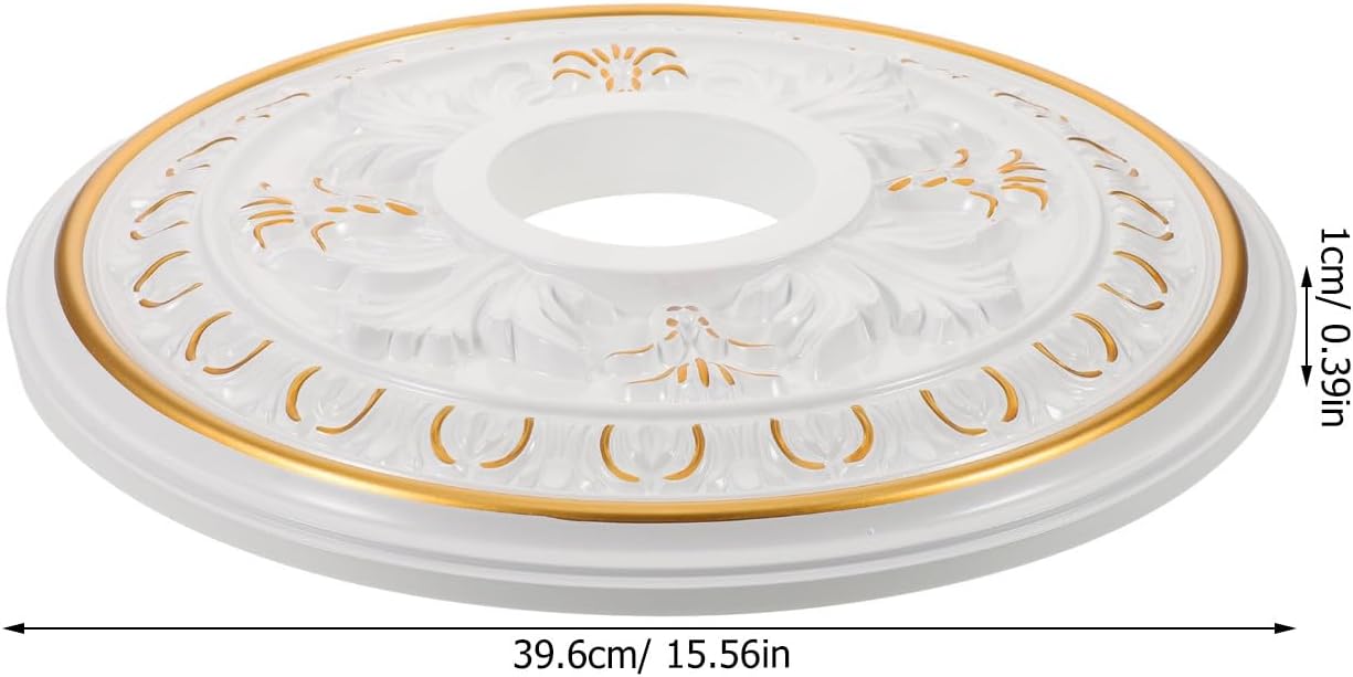 Description Add a classic accent to your ceiling decor using this ceiling rosette, which doubles as a lightweight ceiling medallion for pendant lights or round shape panel lights. The white ceiling lampshade complements contemporary and traditional styles, while the easy-to-clean surface make sure long-term beauty. Features -Color:Multi -Material:ABS -Size:39.60X39.60X1.00cm/15.56X15.56X0.39in - craftsmanship: elevate your ceiling with the medallion ring for light fixtures, featuring retro designs that create a charming and inviting ambiance throughout your home -Universal size versatility: measuring 39.6 cm across with an 11 cm inner diameter, this ceiling medallion suits most ceiling light round panels, ceiling fan cover plates, and rosettes for seamless installation -Strength with reduced weight: the lightweight ceiling medallion construction allows for secure support of ceiling fan medallions and round shape panel lights while minimizing load on your ceiling -convenient cleaning: the molded ceiling medallion is easy to wipe clean, keeping your white ceiling light shade or decorative ceiling plate looking in any environment -Fits every room: whether for a chandelier in the dining room or hanging lights in the hallway, this round ceiling decoration delivers both style and function for a variety of interior design projects